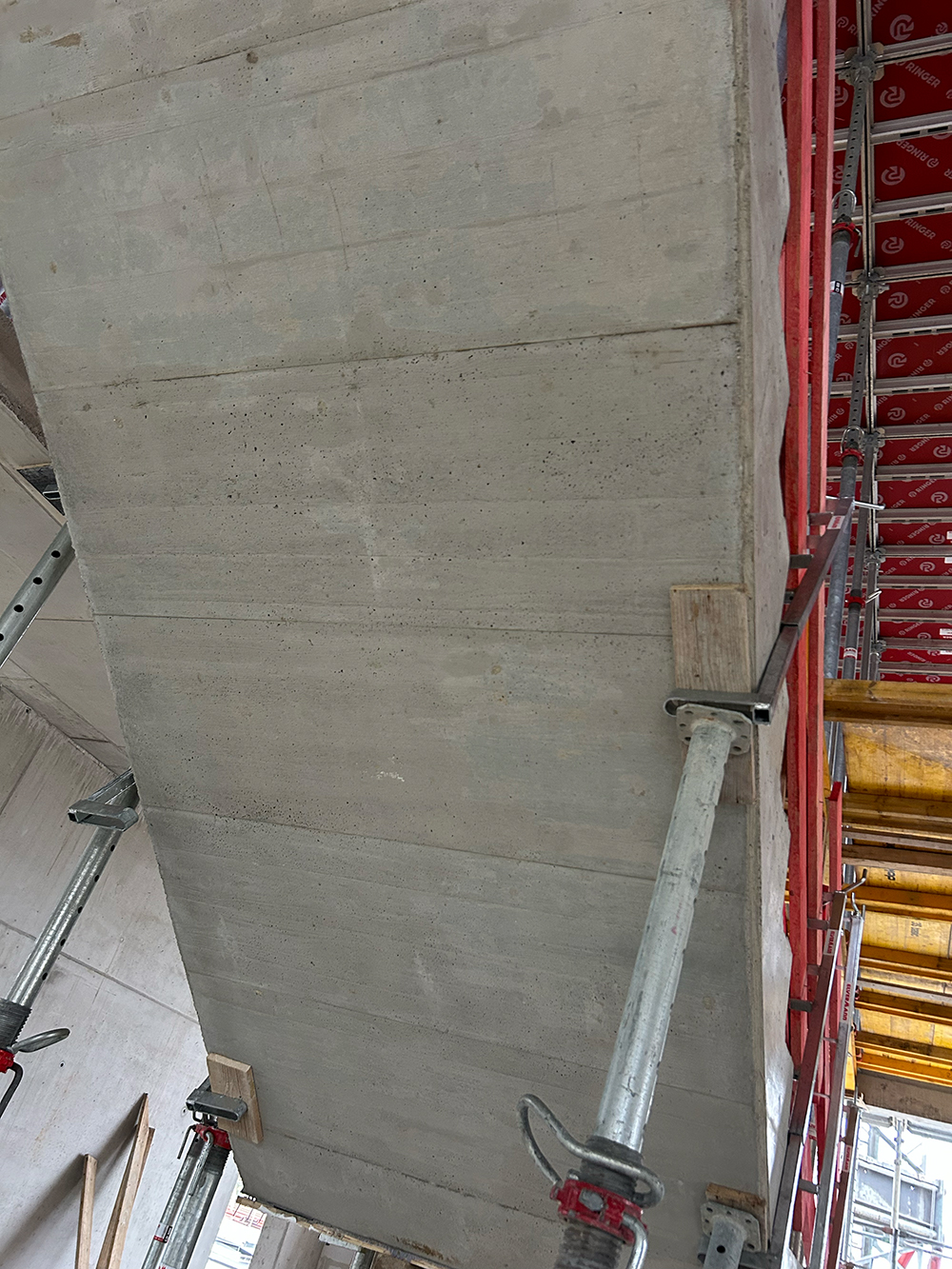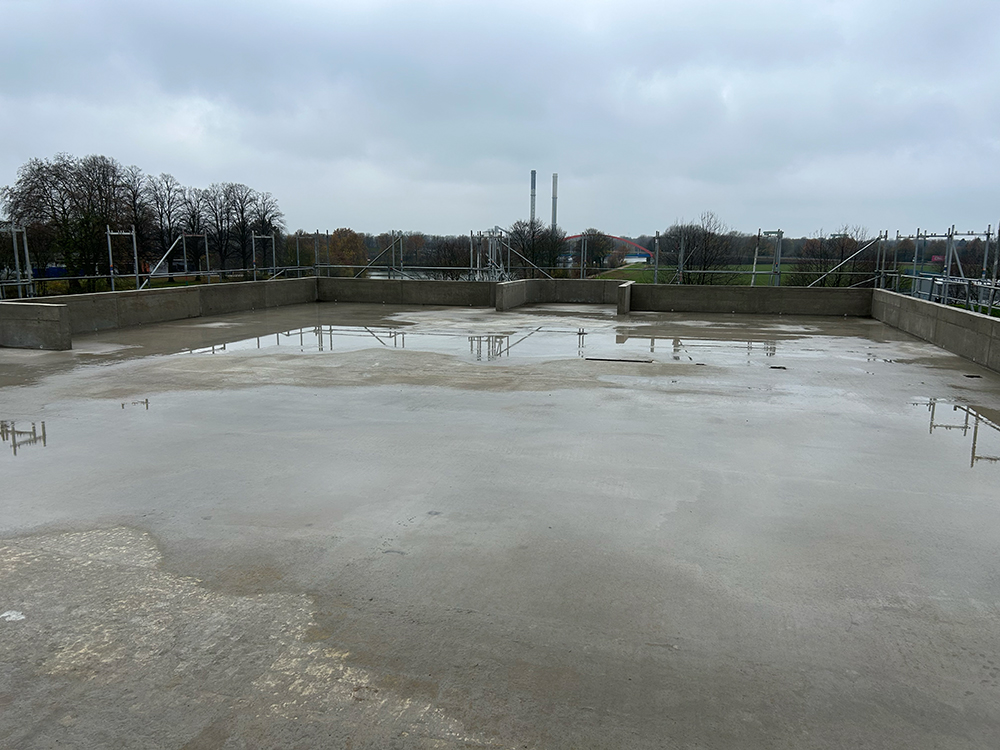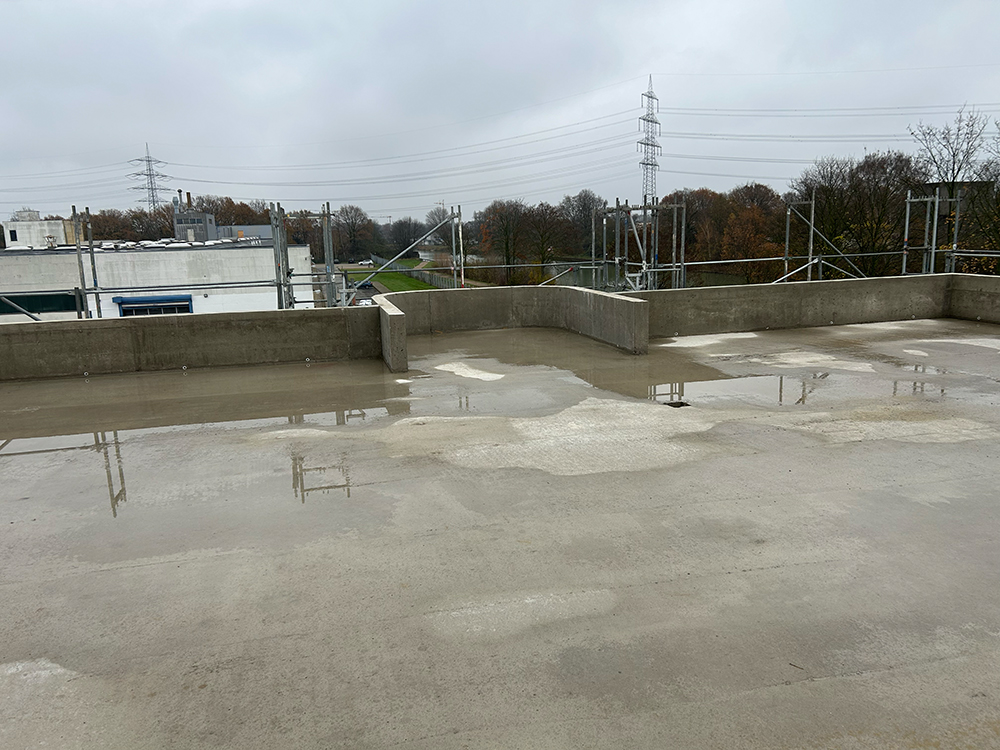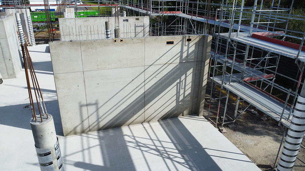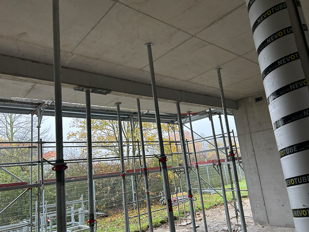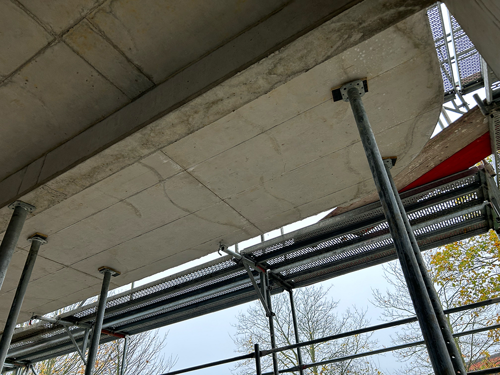Bei diesem Projekt bestand die Herausforderung in der Erstellung der Betonwände und Betondecken in Sichtbetonqualität. Hierzu hatten wir für die Decken eine Systemschalung gewählt. An den auskragenden Bauteilen der Decke sowie den Betonaufkantungen über der OG-Decke haben wir die Kanten in runder Schalung erstellt. Die Betontreppe wurde von uns ebenfalls örtlich geschalt.