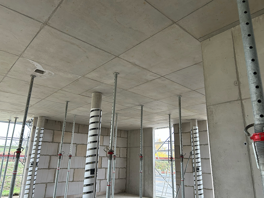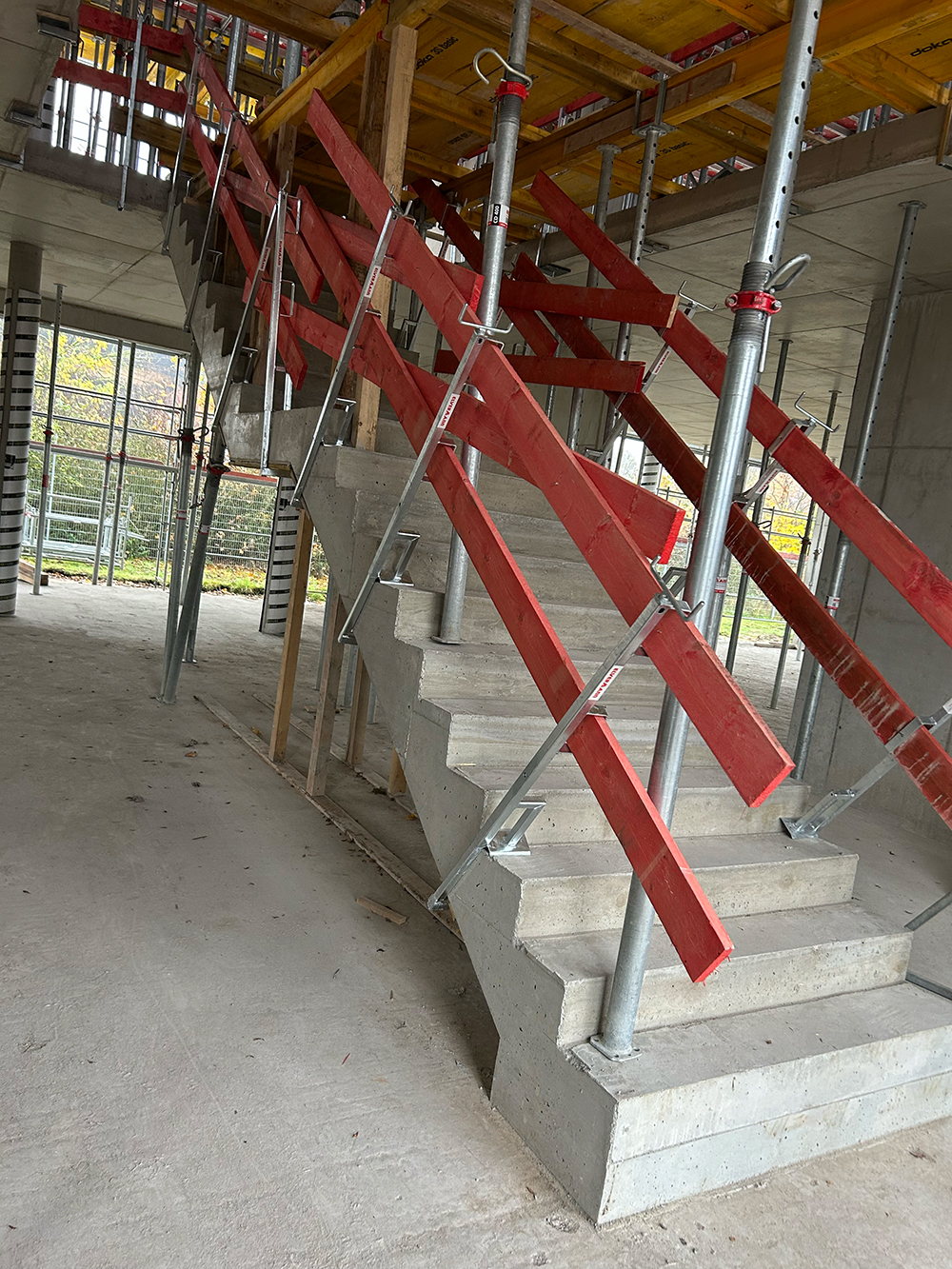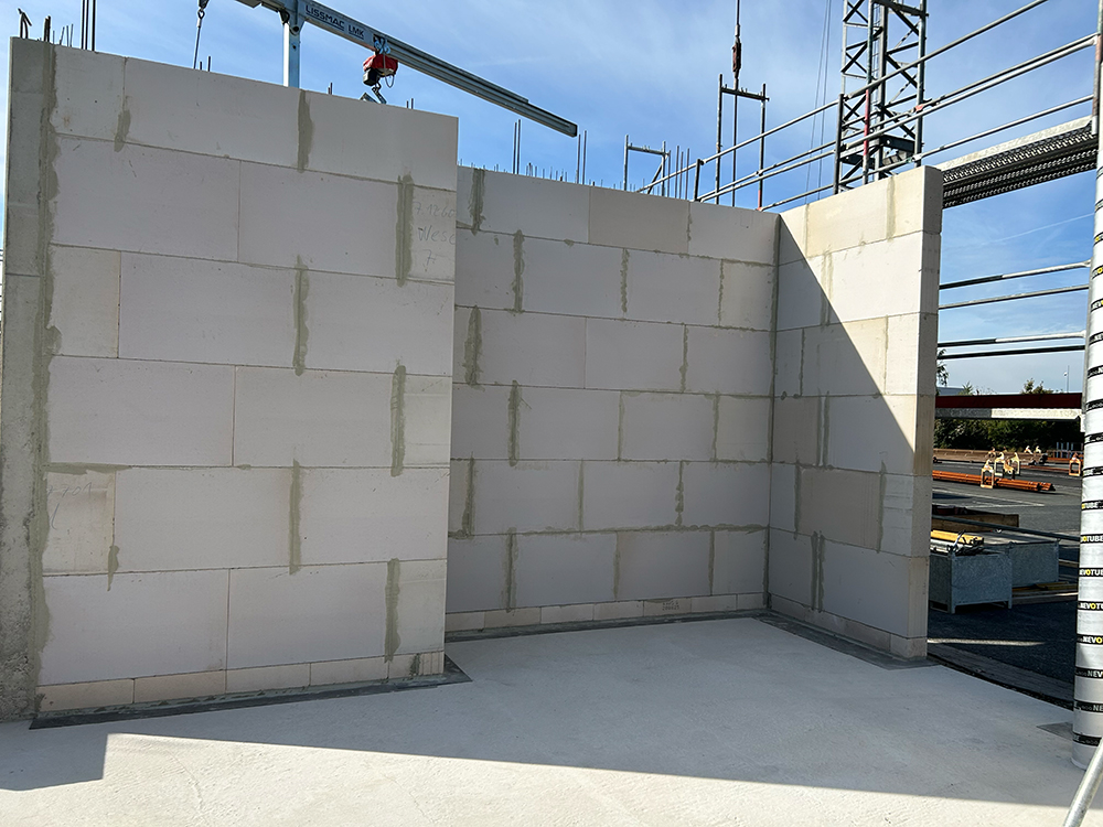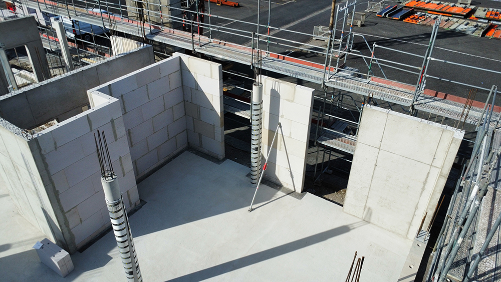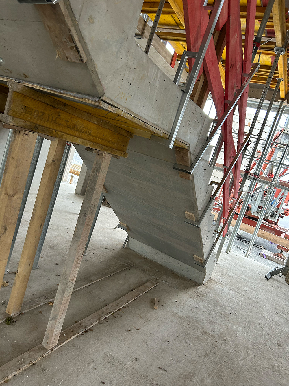 Bei diesem Projekt bestand die Herausforderung in der Erstellung der Betonwände und Betondecken in Sichtbetonqualität. Hierzu hatten wir für die Decken eine Systemschalung gewählt. An den auskragenden Bauteilen der Decke sowie den Betonaufkantungen über der OG-Decke haben wir die Kanten in runder Schalung erstellt. Die Betontreppe wurde von uns ebenfalls örtlich geschalt.