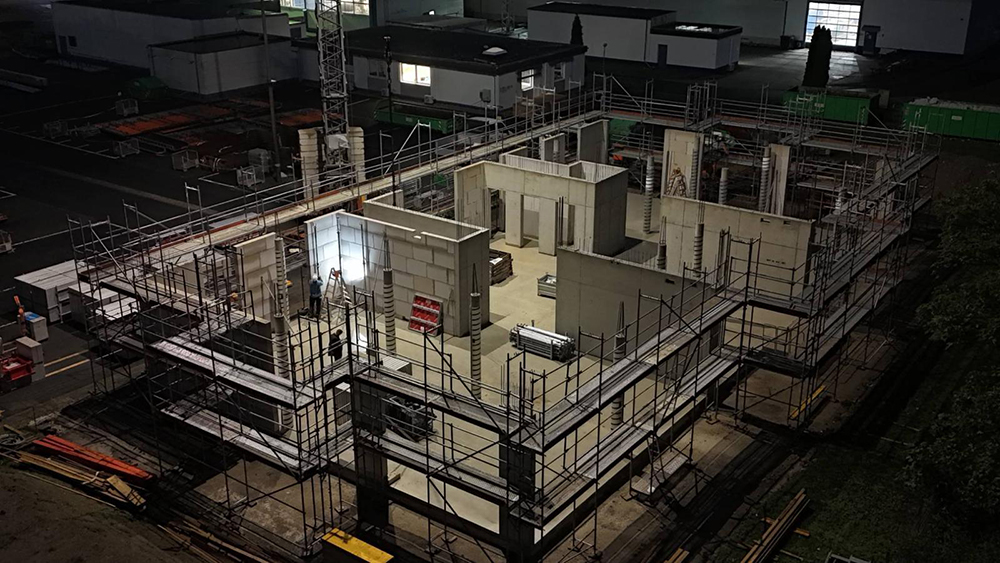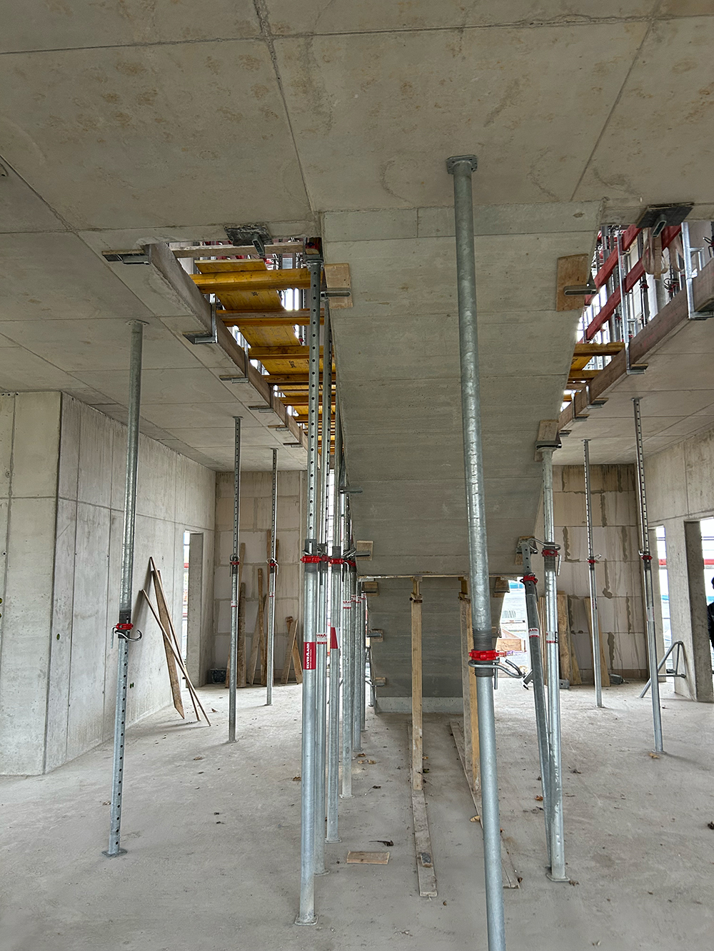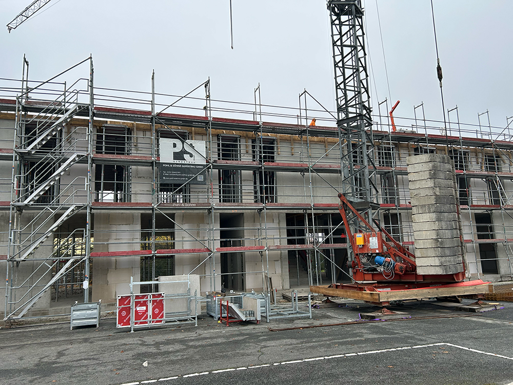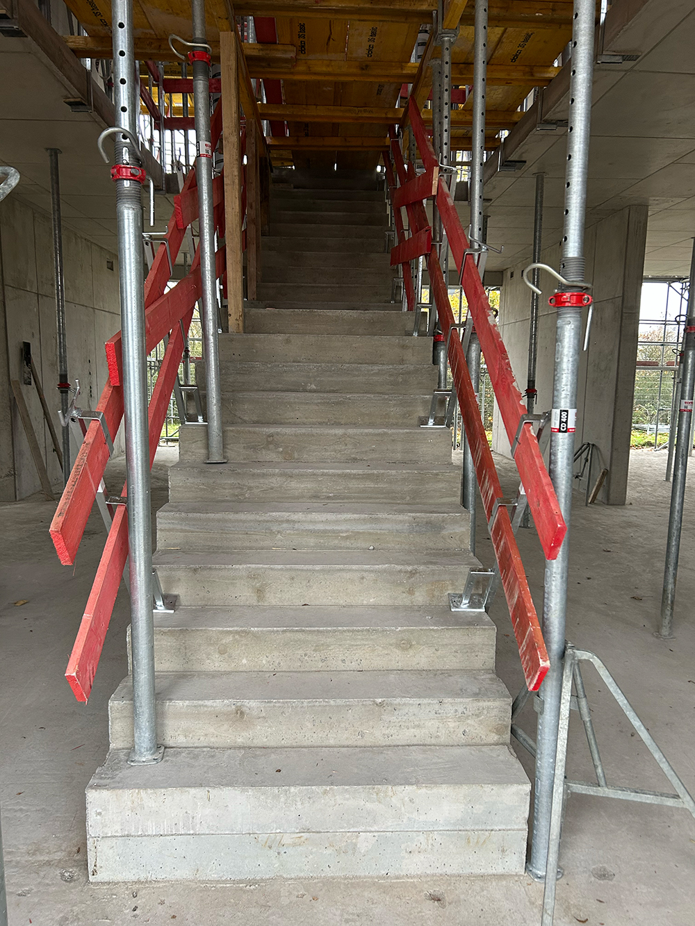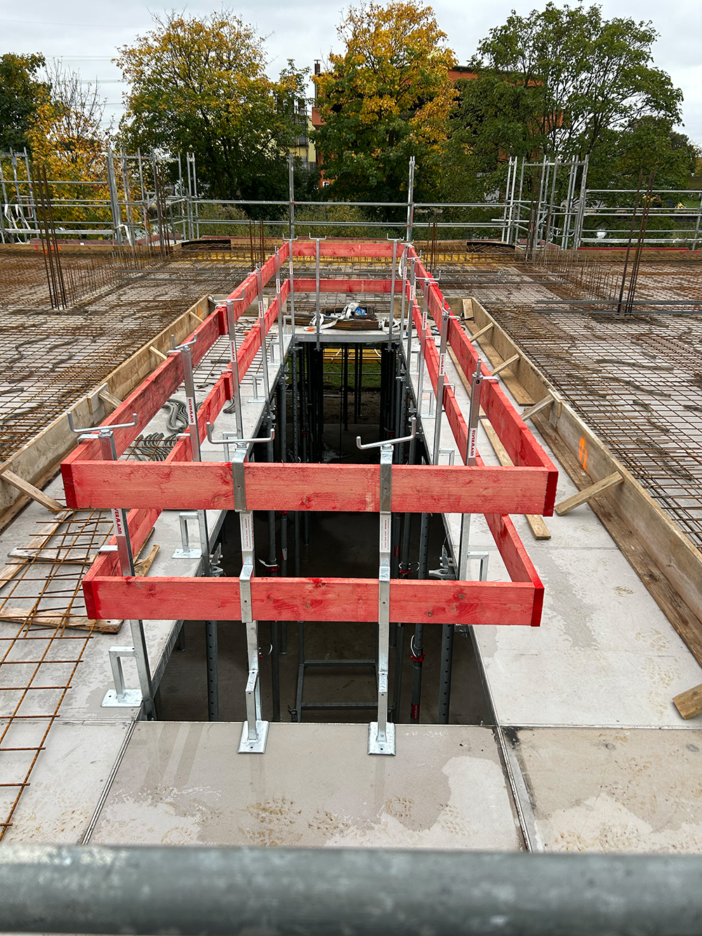Bei diesem Projekt bestand die Herausforderung in der Erstellung der Betonwände und Betondecken in Sichtbetonqualität. Hierzu hatten wir für die Decken eine Systemschalung gewählt. An den auskragenden Bauteilen der Decke sowie den Betonaufkantungen über der OG-Decke haben wir die Kanten in runder Schalung erstellt. Die Betontreppe wurde von uns ebenfalls örtlich geschalt.